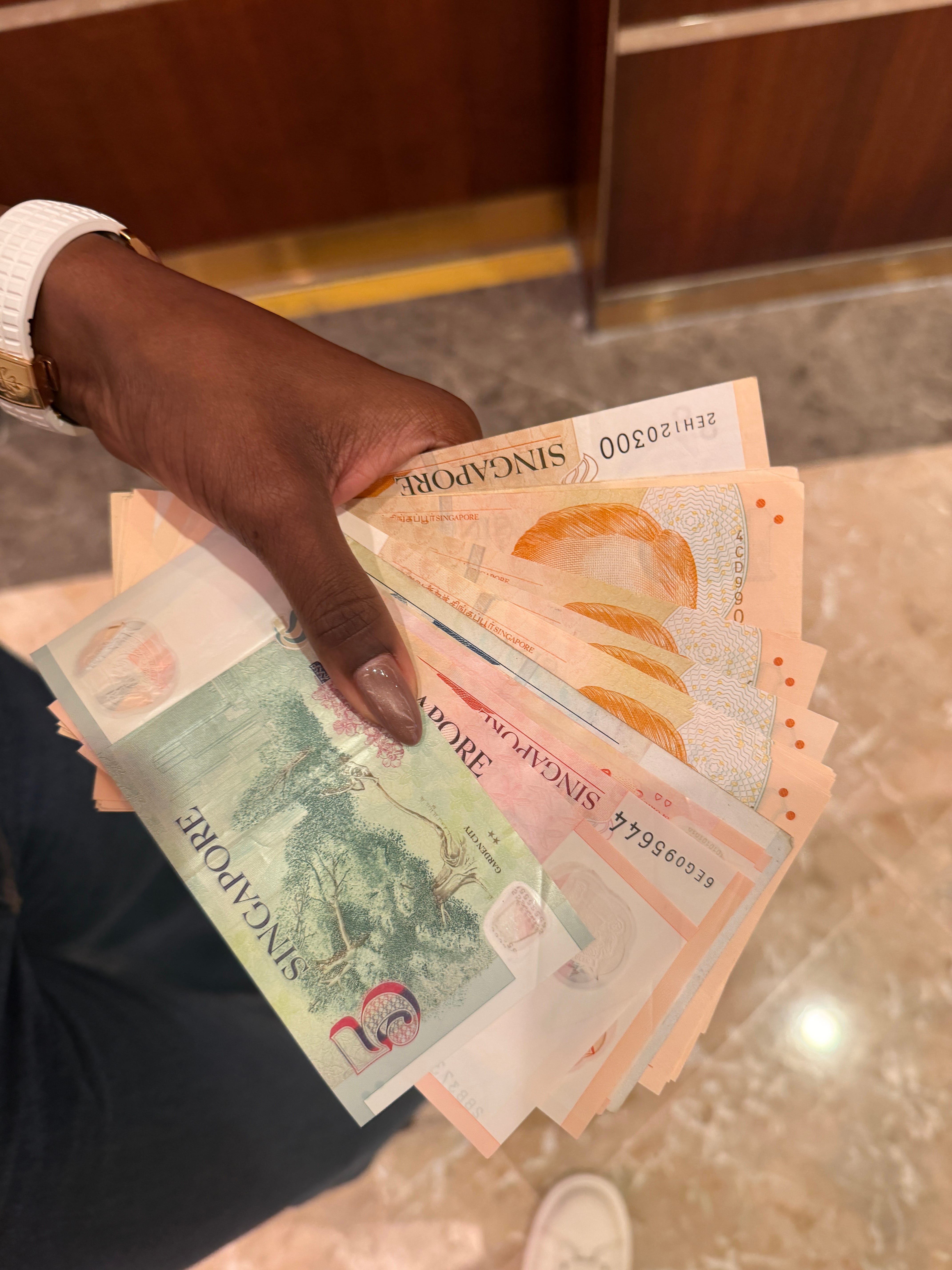 At the currency exchange counter within the airport departure terminal, we converted our winnings from Singapore dollars to UAE dirhams. It was about 3,100 AED.